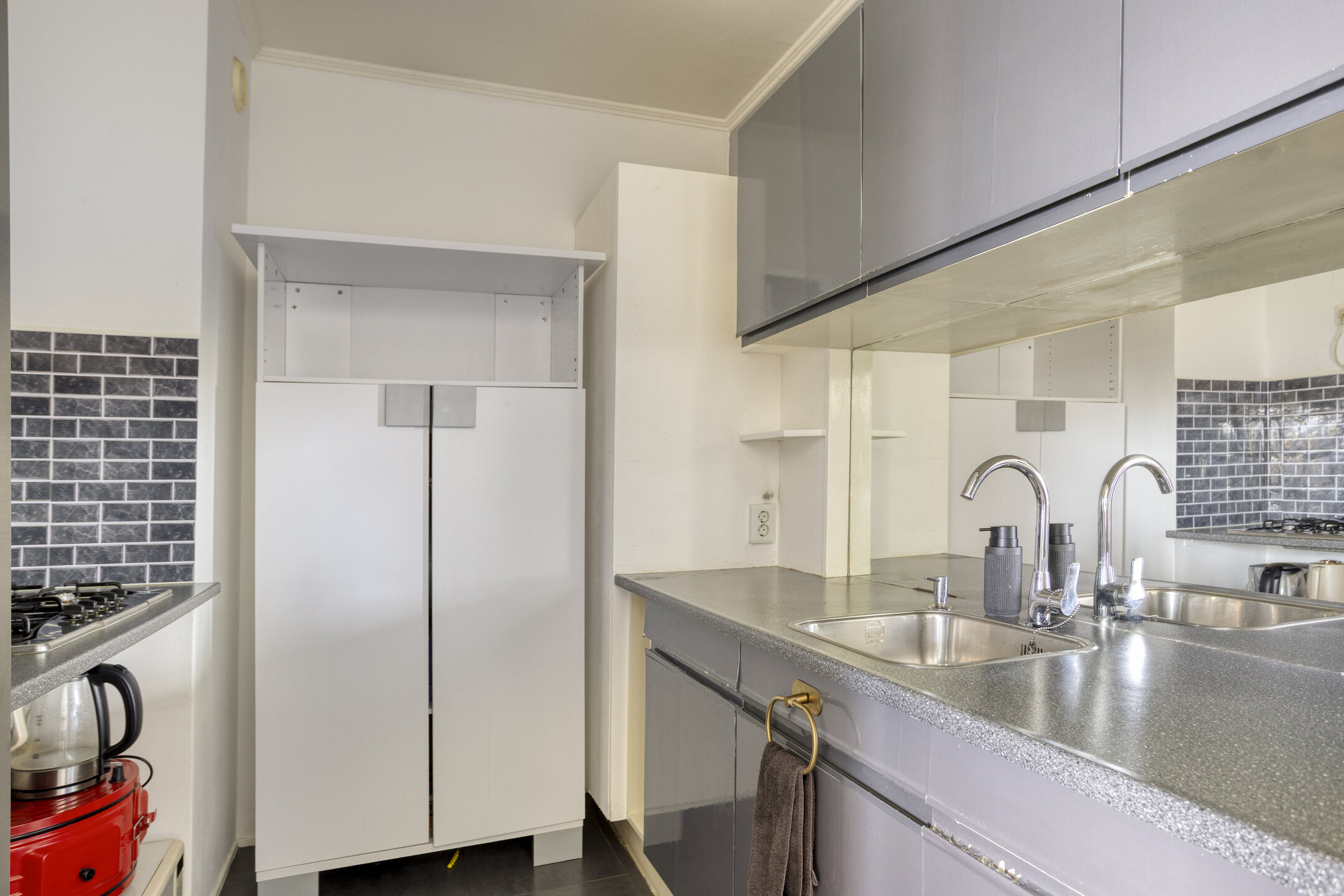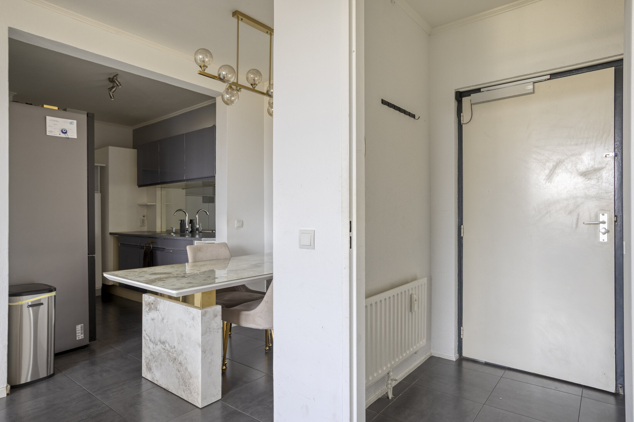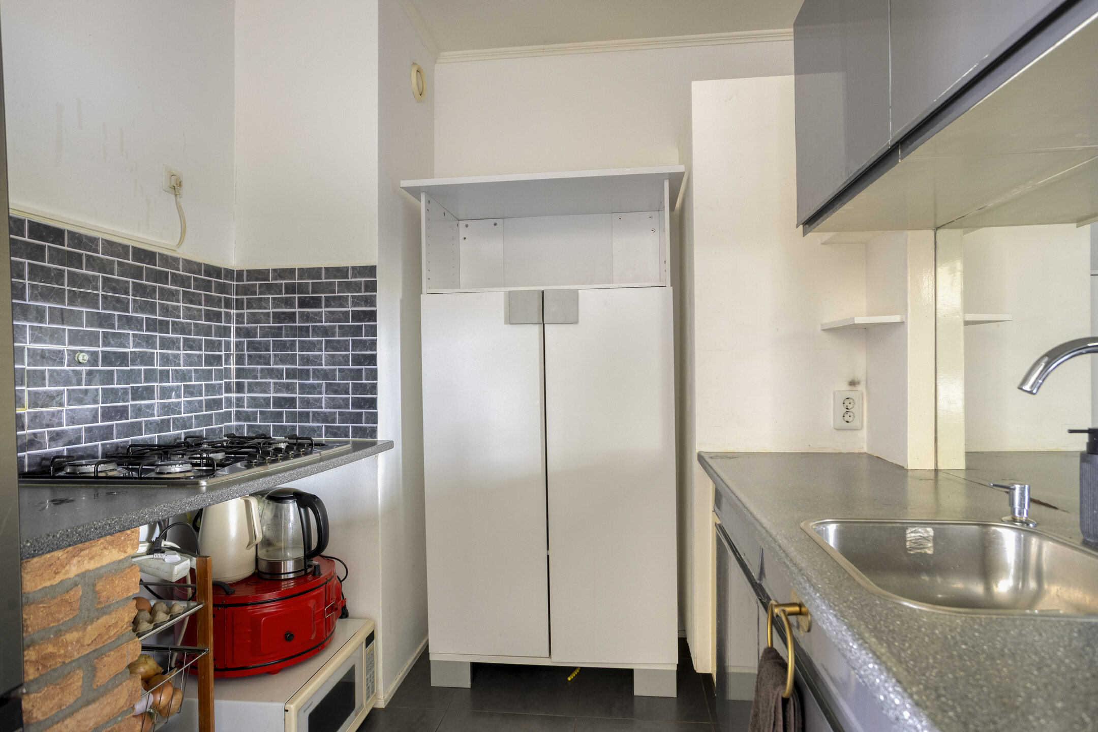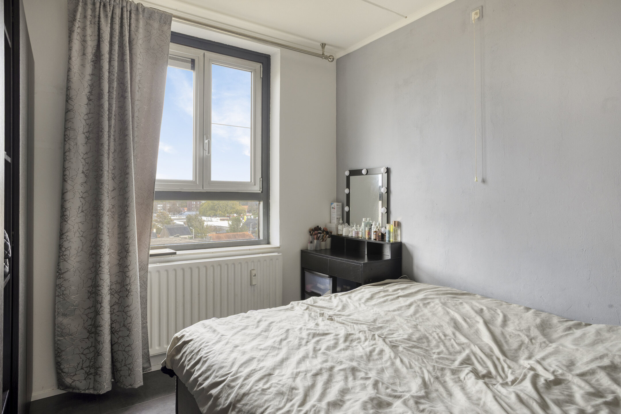 U betreedt de woning via de hal/entree met meterkast (4 groepen en aardlekschakelaar) en een praktische bergkast. Vanuit de hal komt u in de lichte woonkamer met grote raampartijen en toegang tot het balkon. De woonkamer beschikt over een open keuken met 5-pits gaskookplaat en de opstelplaats van de huurboiler. Vanuit de overloop bereikt u de slaapkamer en de badkamer, welke is voorzien van een toilet, douche, wastafel en wasmachineaansluiting. Dankzij de ligging op de 5e verdieping geniet u vanaf het balkon van een vrij en weids uitzicht.