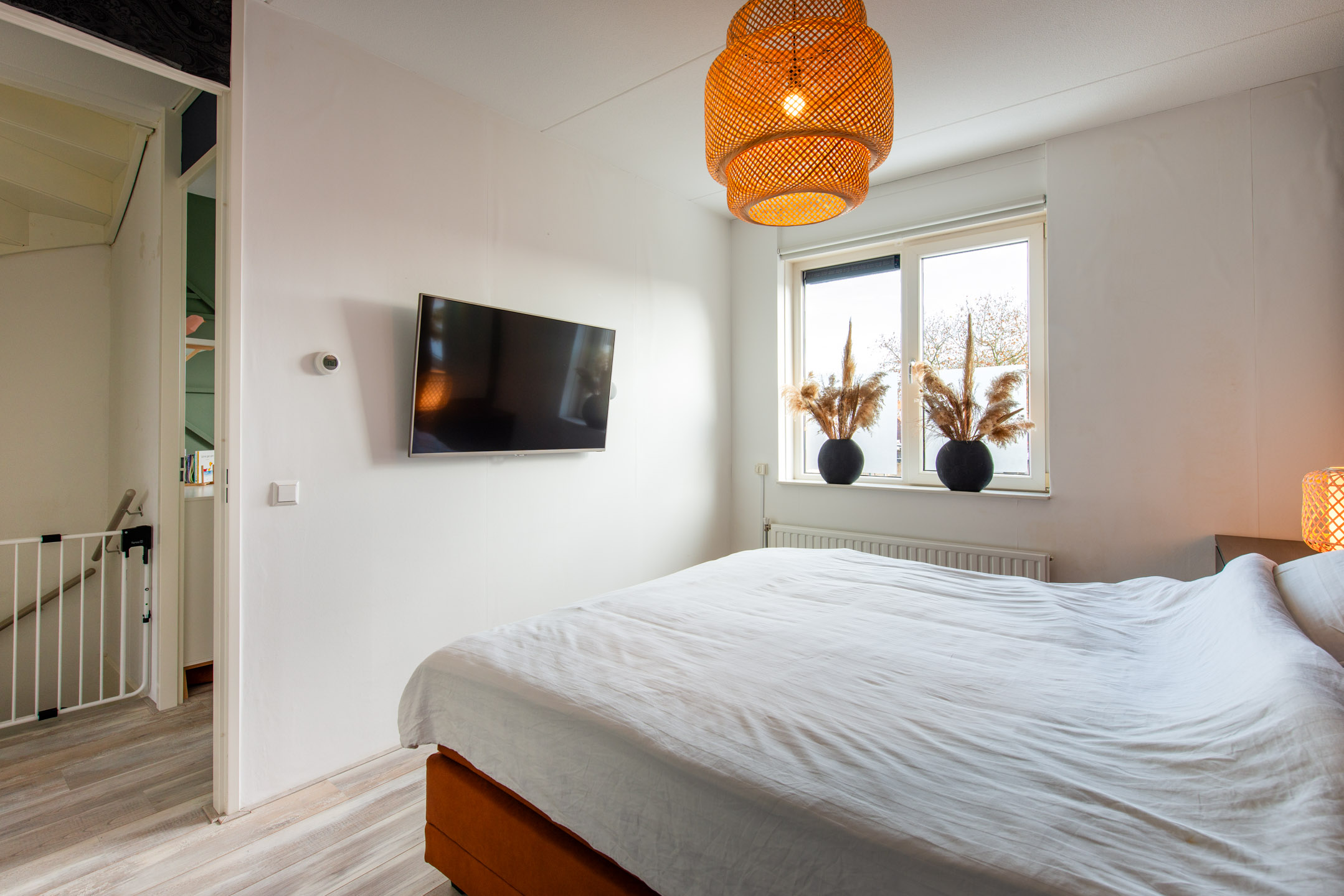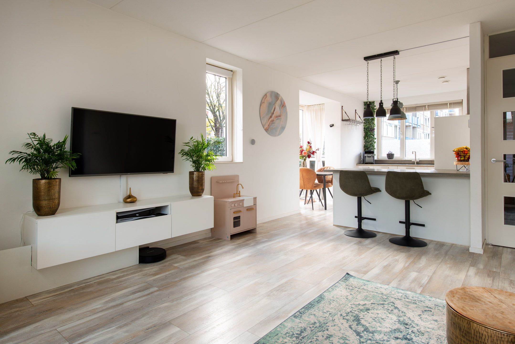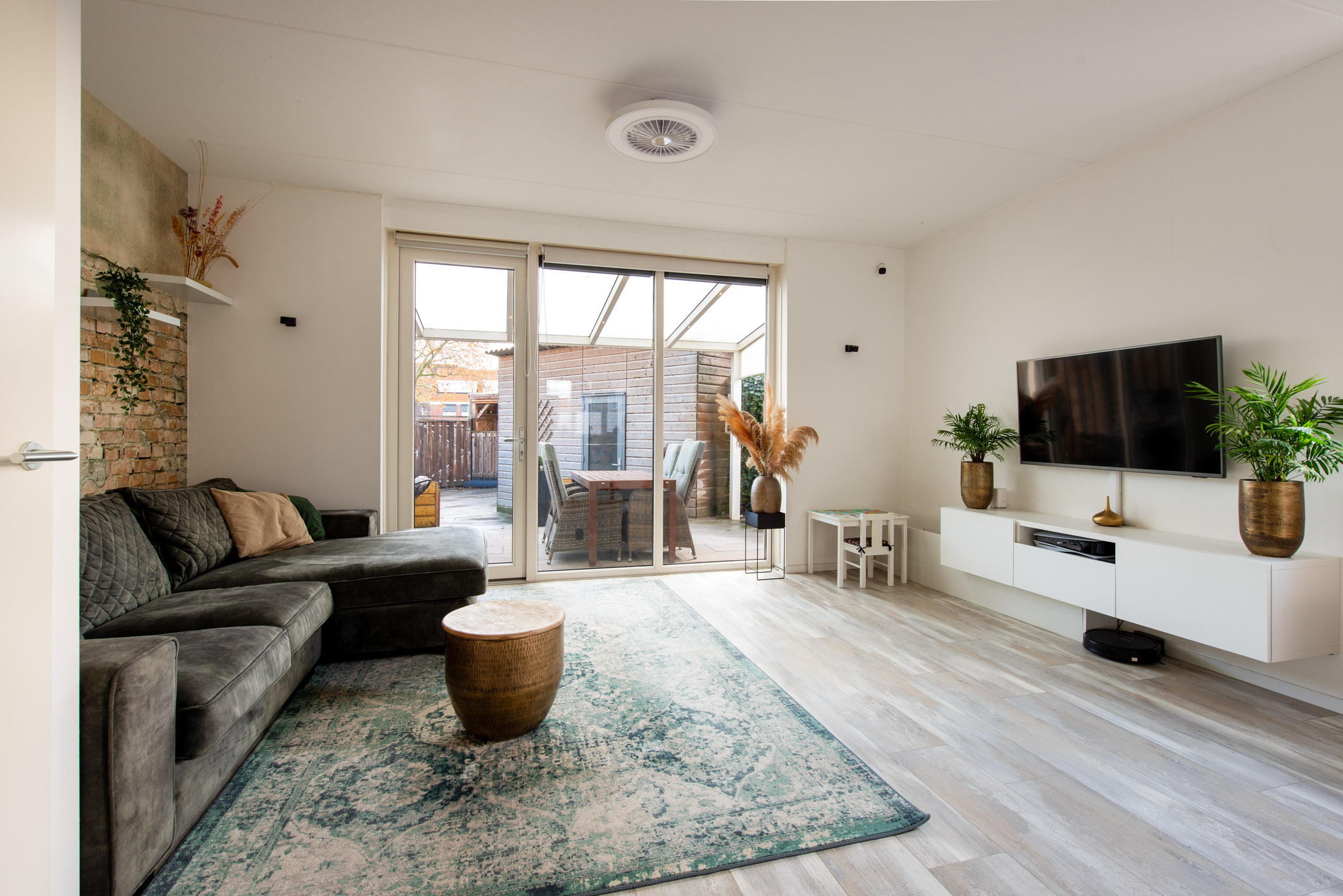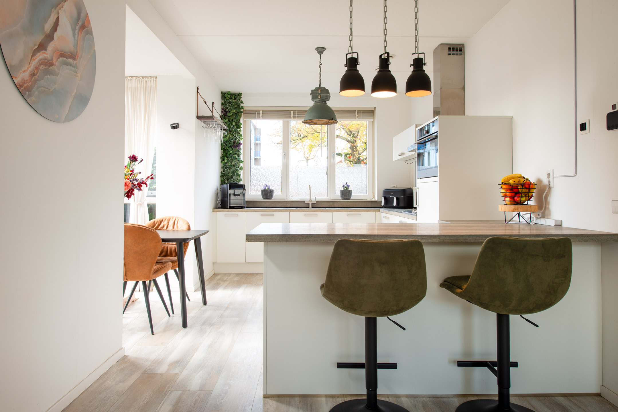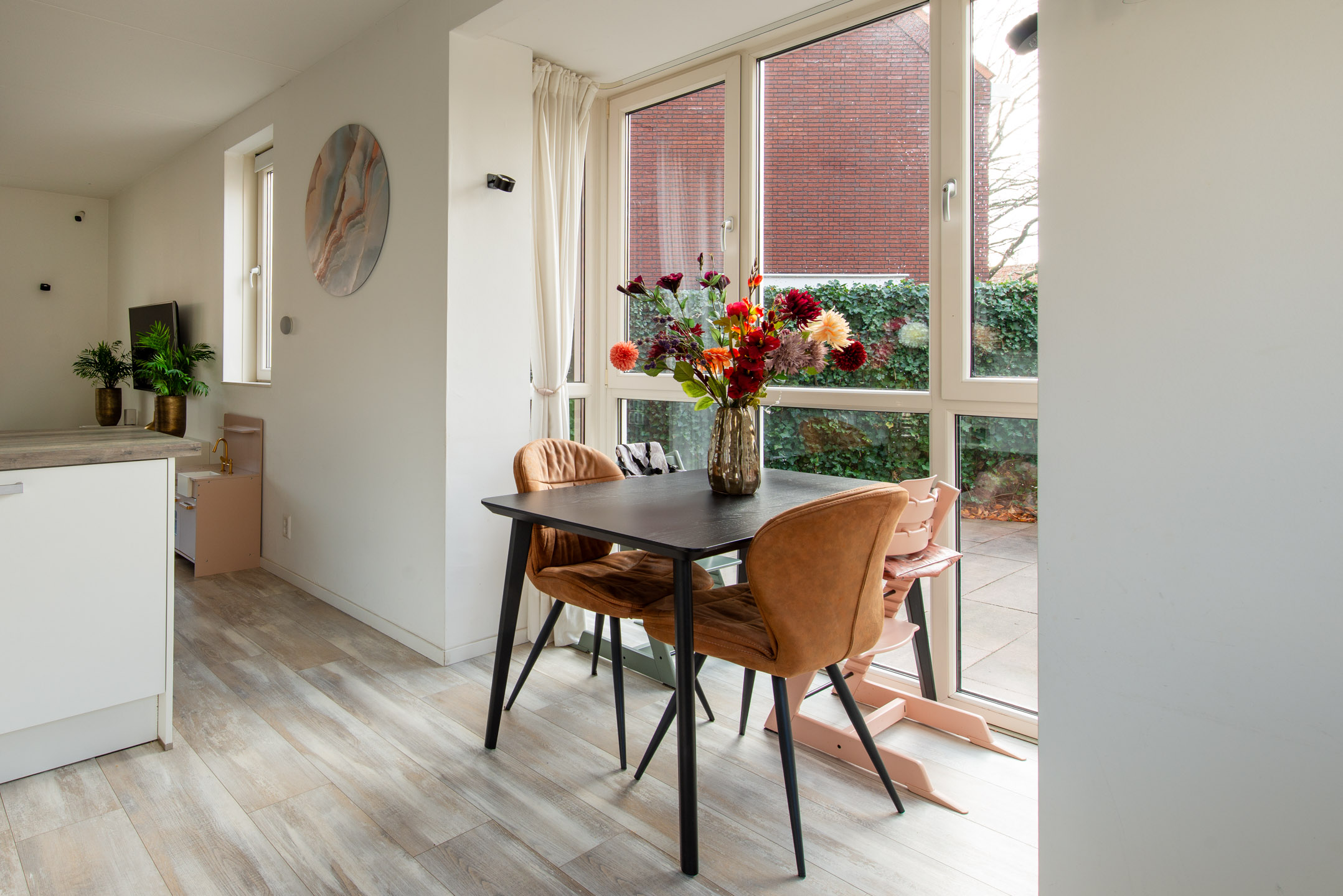 Via de verzorgde voortuin komt u binnen in de hal/entree, waar zich de meterkast en het toilet bevinden. De lichte woonkamer voelt direct ruimtelijk aan, mede dankzij de erker aan de zijkant waar momenteel de eethoek is gesitueerd. De open, moderne keuken is in een praktische U-opstelling geplaatst en beschikt over een bar en diverse inbouwapparatuur, waaronder een 4-pits gaskookplaat, vaatwasser, koelkast, afzuigkap, combi-oven en een kokend waterkraan van HOWAT voor direct heet water. De eethoek is ook zeer mooi te realiseren in de nis van de woonkamer, waardoor er ruimte ontstaat voor een ruimere eettafel waar u met familie en vrienden gezellig kunt tafelen. De woonkamer is tevens voorzien van een handige trapkast en afgewerkt met een laminaatvloer. Via de kunststof achterpui heeft u toegang tot de achtertuin, welke is uitgerust met een overkapping. Vanuit de hal/entree bereikt u via de trap de: