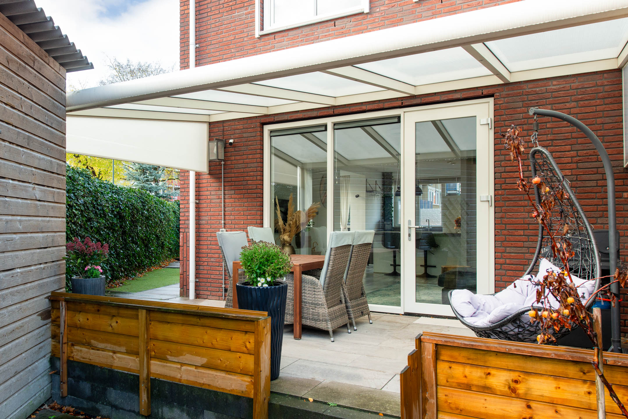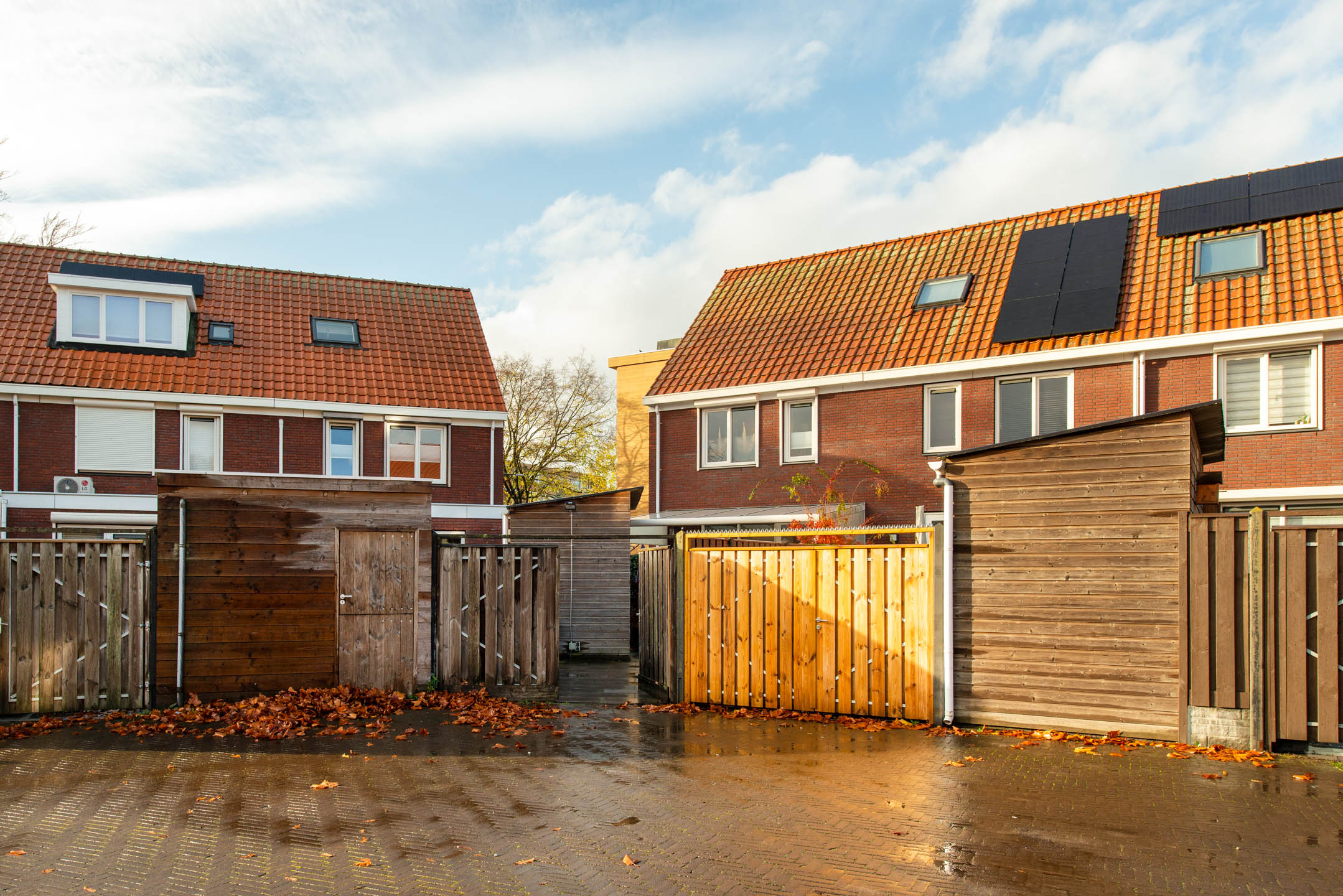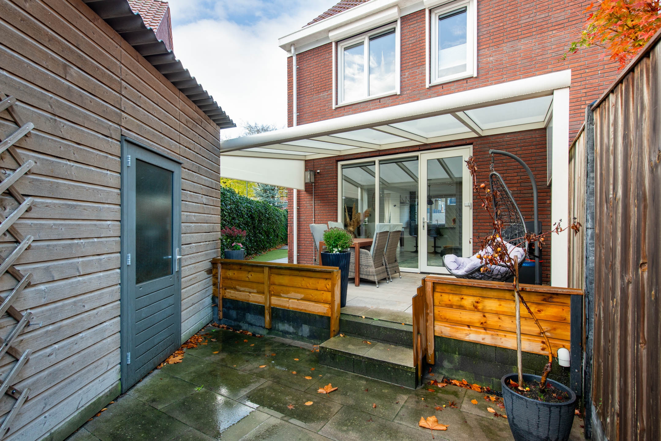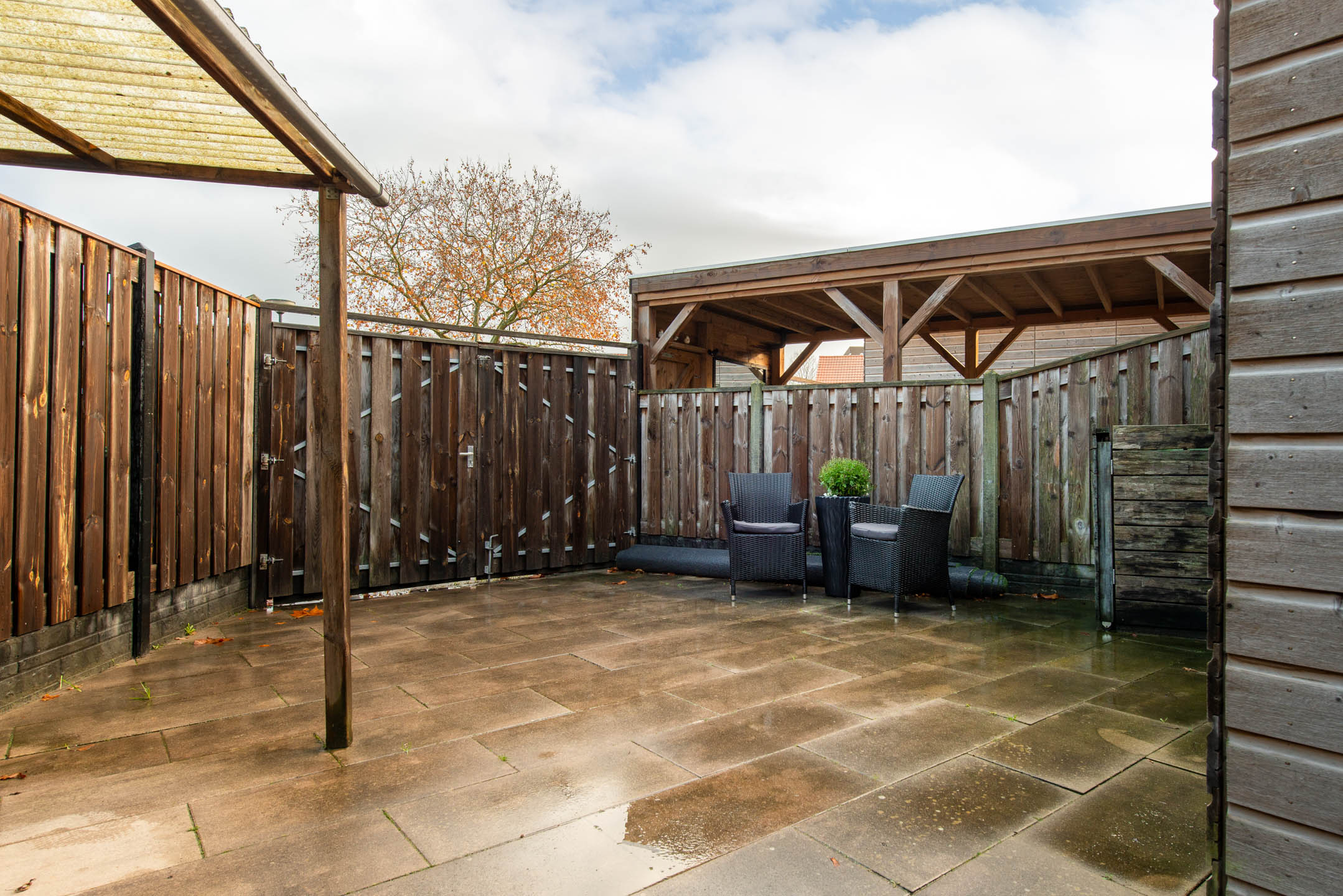 Via de woonkamer heeft u toegang tot de onderhoudsvriendelijke zij- en achtertuin, welke is ingericht met sierbestrating, kunstgras en een in hout opgetrokken berging. Daarnaast is de tuin voorzien van een dubbele toegangspoort, waardoor het mogelijk is de auto op eigen terrein te parkeren.