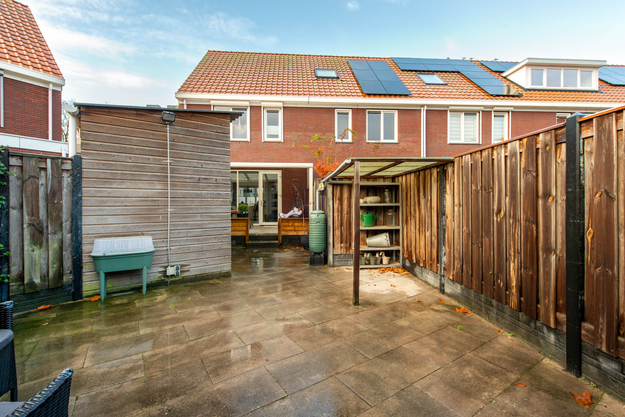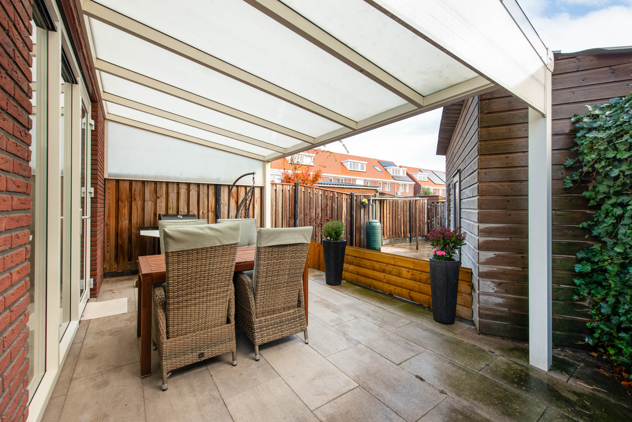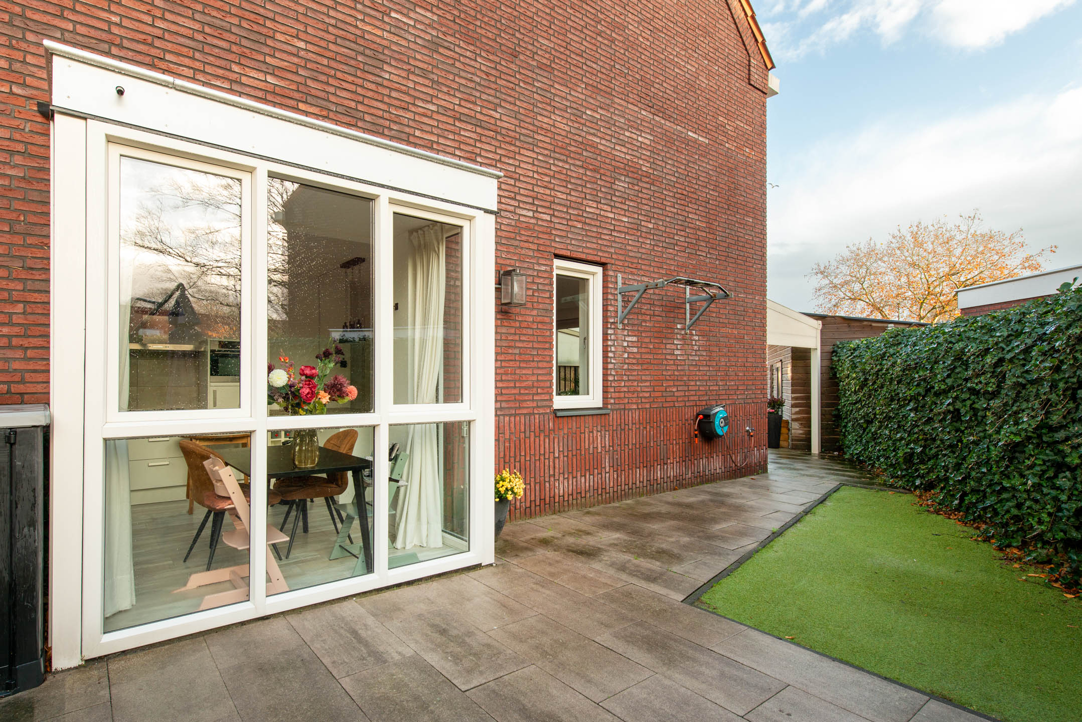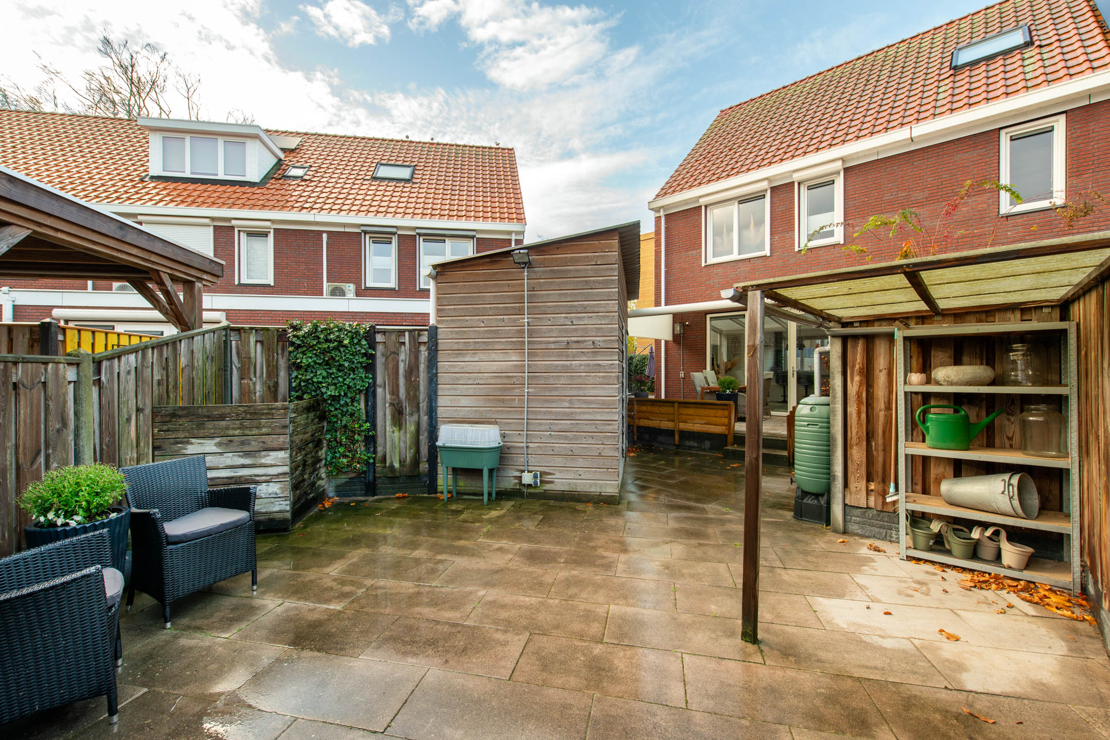 Via de woonkamer heeft u toegang tot de onderhoudsvriendelijke zij- en achtertuin, welke is ingericht met sierbestrating, kunstgras en een in hout opgetrokken berging. Daarnaast is de tuin voorzien van een dubbele toegangspoort, waardoor het mogelijk is de auto op eigen terrein te parkeren.
