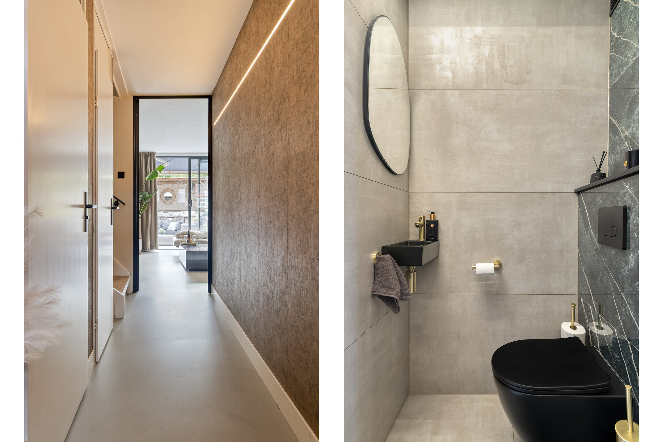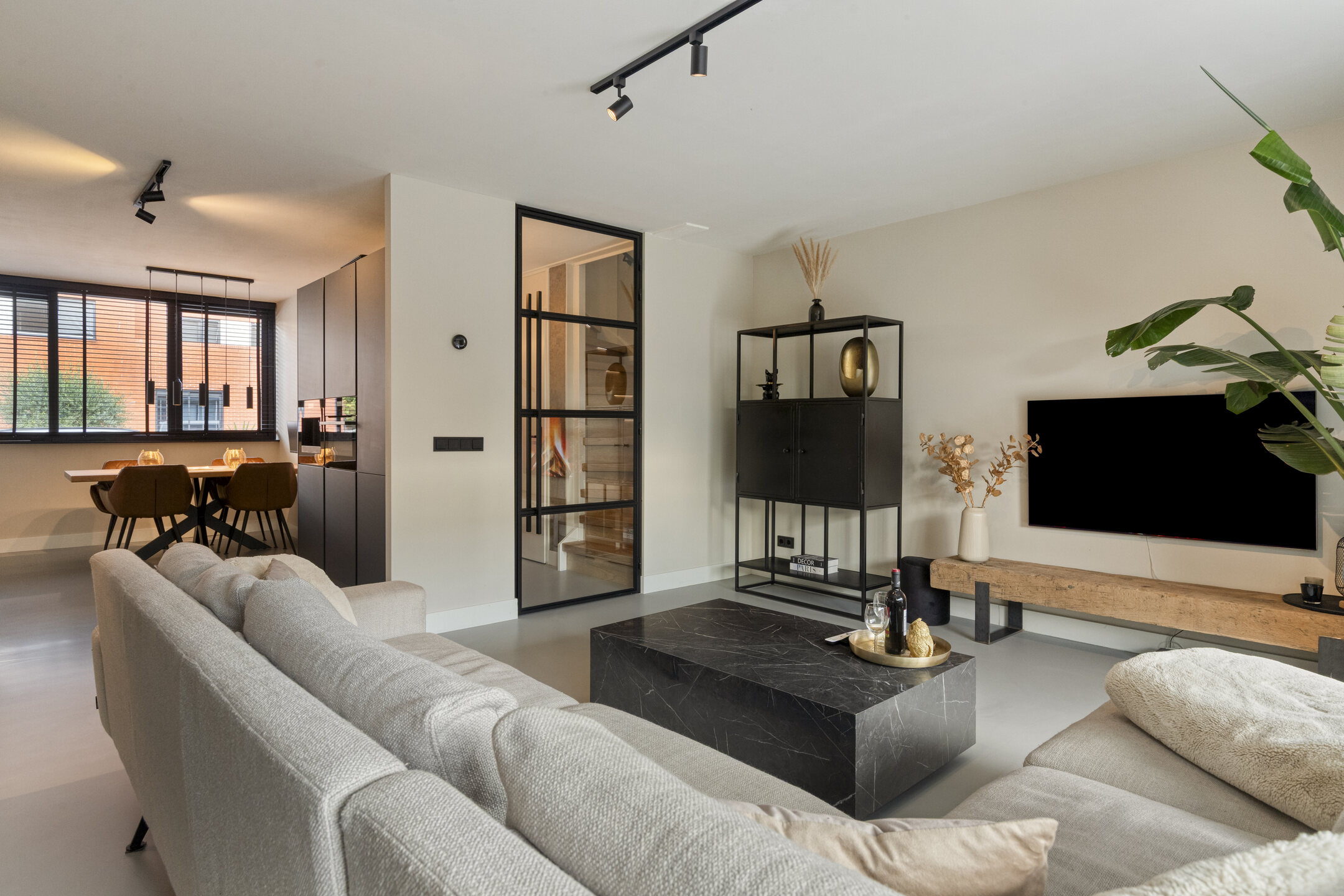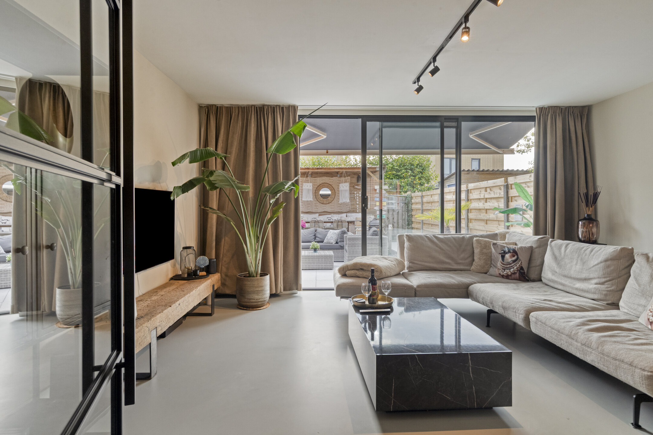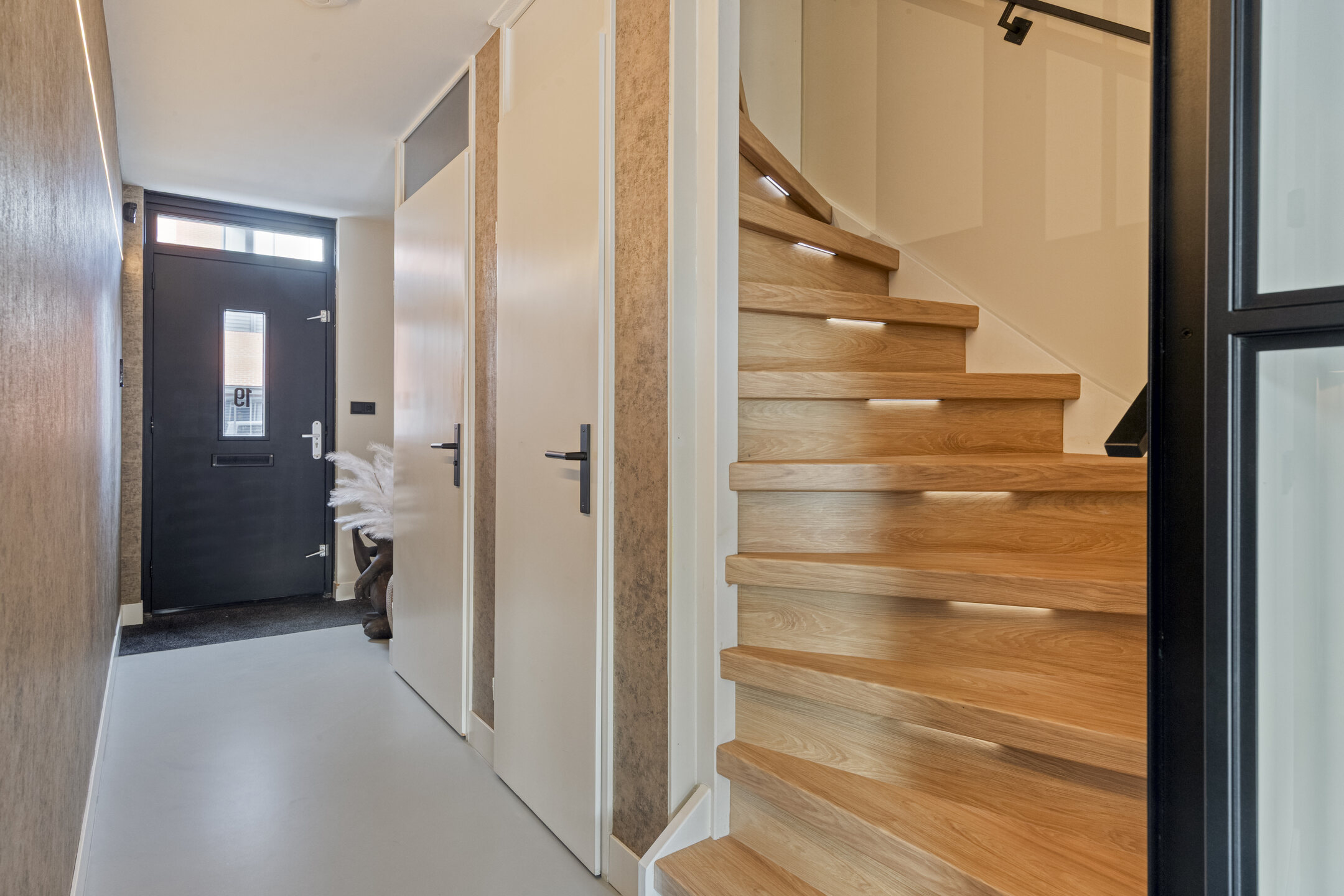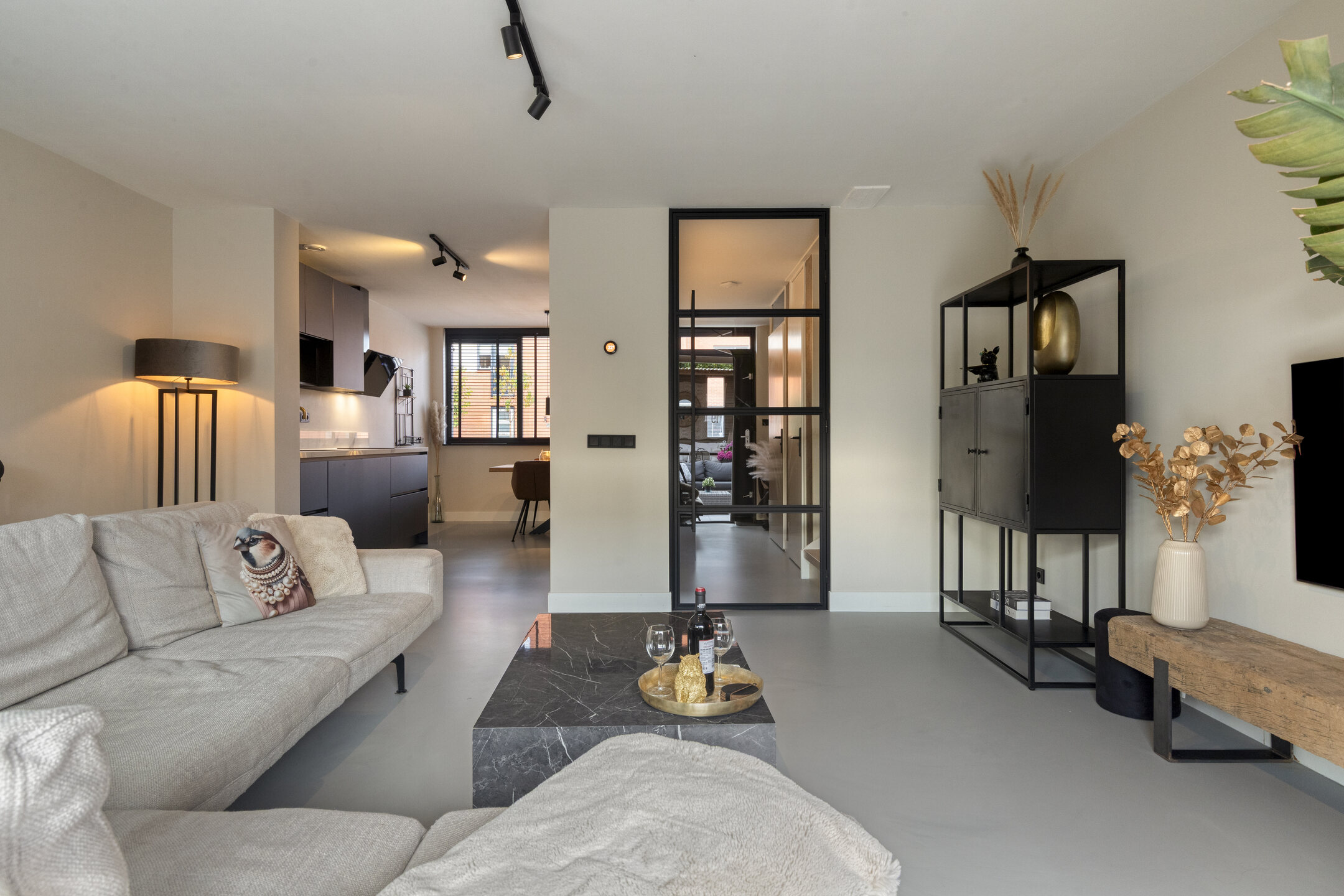 Via de fraai aangelegde voortuin bereikt u de hal/entree, waar u direct wordt verrast door de moderne en stijlvolle afwerking. De hal beschikt over de meterkast, een vernieuwd toilet (2025) en een praktische trapkast met extra bergruimte. Vanuit de hal leidt een elegante taatsdeur u naar de sfeervolle woonkamer, uitgevoerd met een strakke gietvloer voorzien van vloerverwarming. De grote aluminium schuifpui zorgt voor een zee aan licht en biedt een prachtig zicht op de achtertuin.