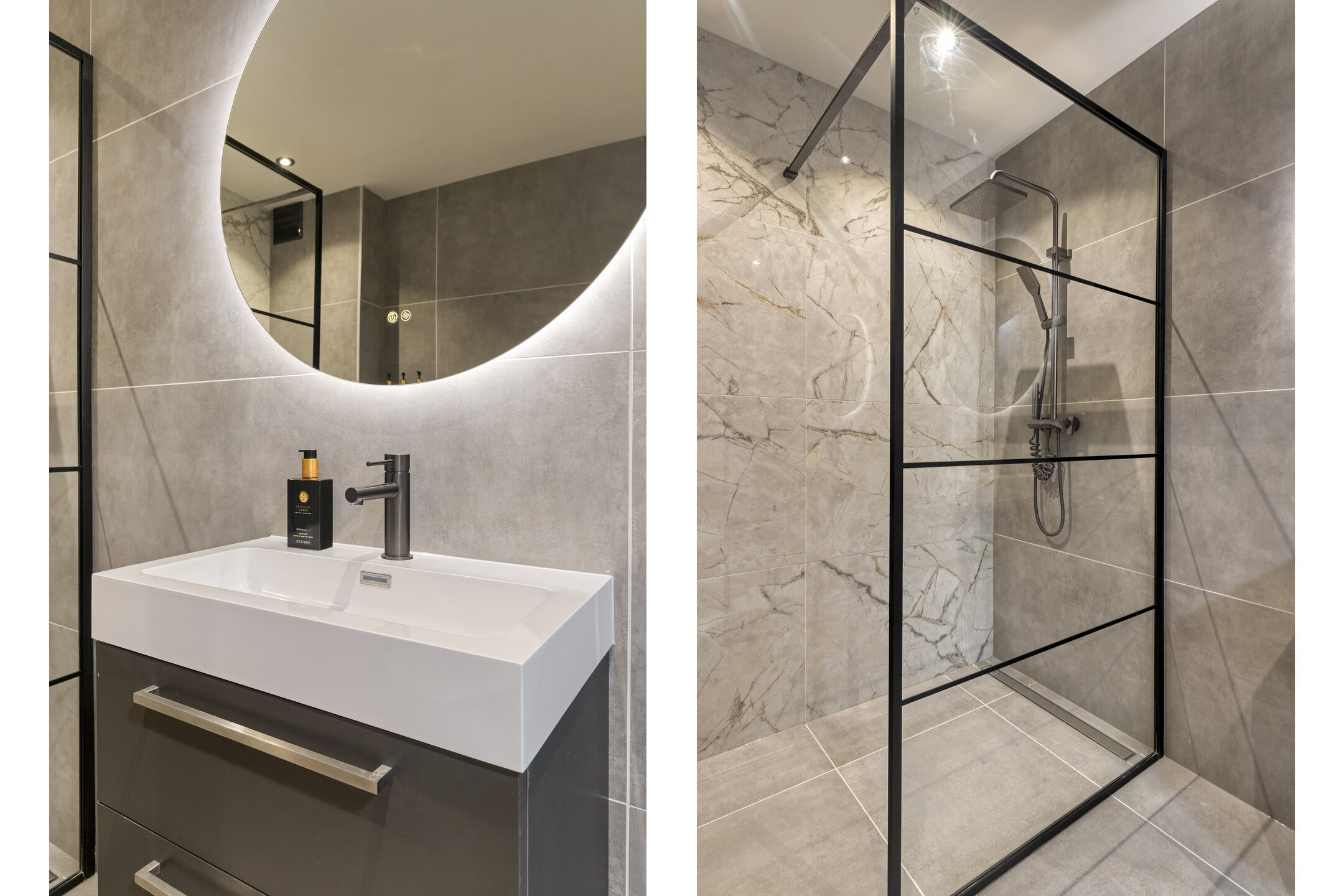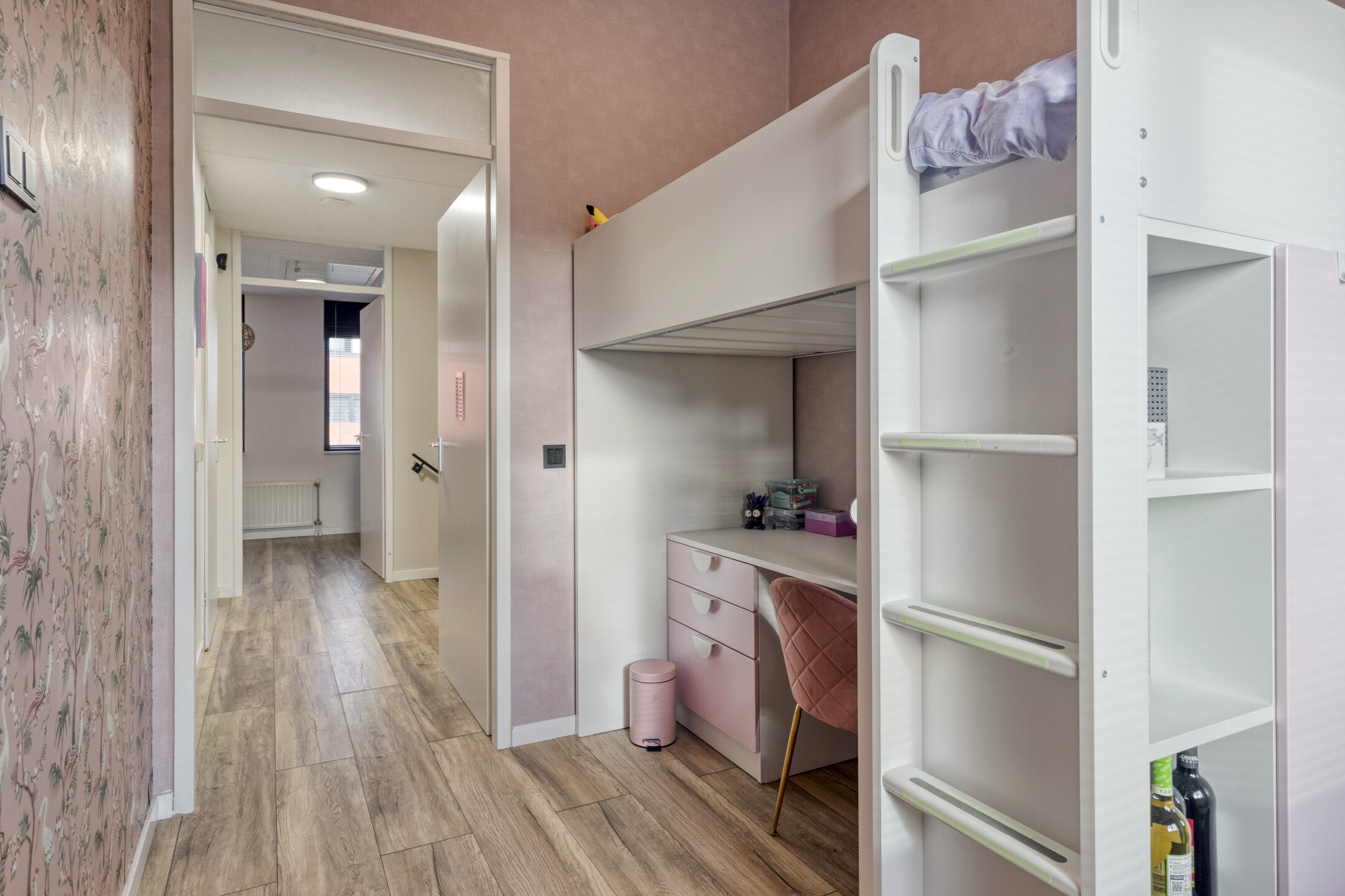 De overloop biedt toegang tot drie slaapkamers, een bergkast met opstelplaats van de HR-combiketel en de recent vernieuwde badkamer (2025). De badkamer is ingericht met een inloopdouche, modern wastafelmeubel en toilet, geheel in de luxe stijl van de rest van de woning. De slaapkamers zijn voorzien van een nette laminaatvloer.