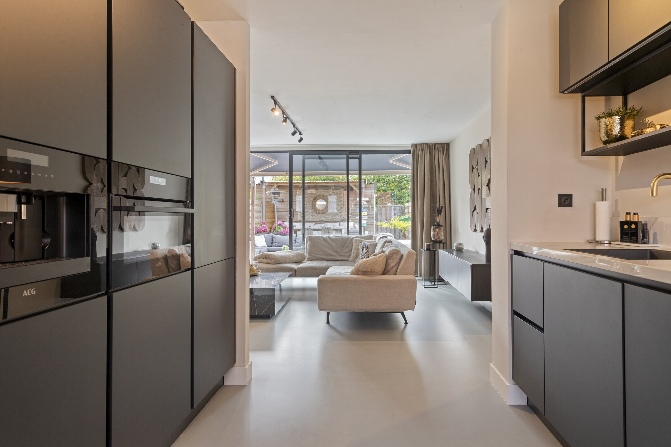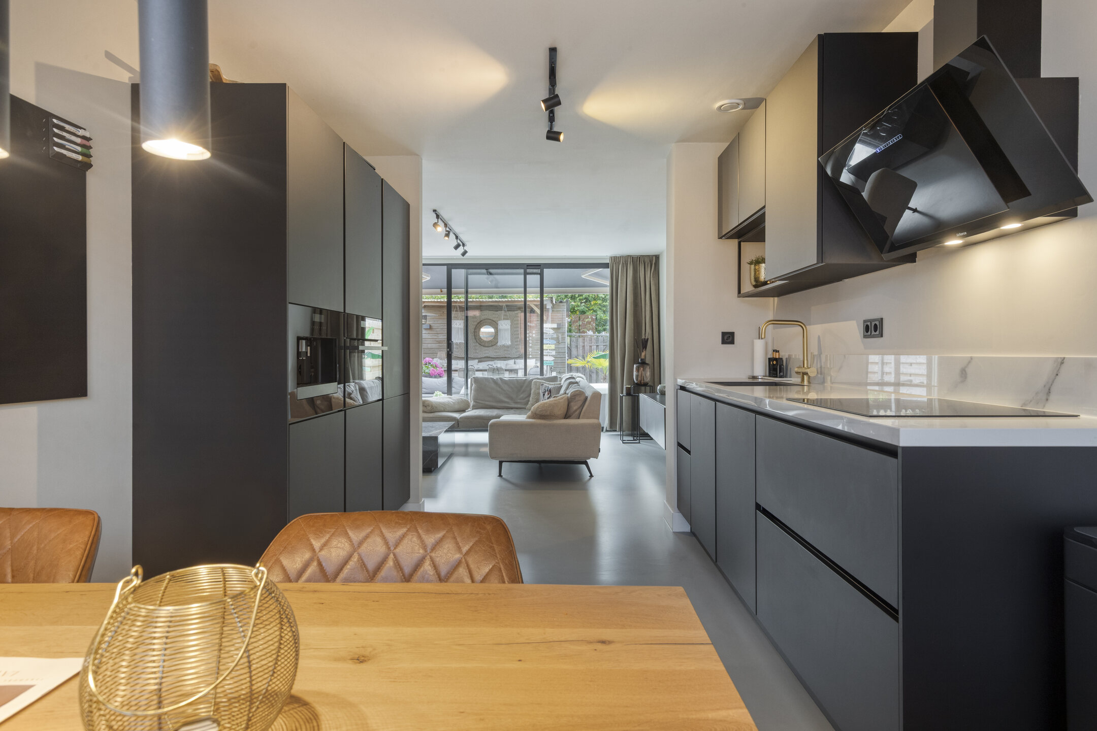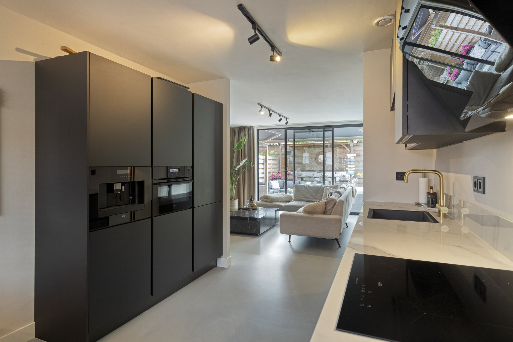 Aan de voorzijde van de woning bevindt zich de moderne keuken (2023), uitgerust met hoogwaardige inbouwapparatuur zoals een inductiekookplaat, afzuigkap, vaatwasser, combi-oven en ingebouwd koffieapparaat. De woonkamer ademt comfort, stijl en eigentijdse klasse, een heerlijke plek om thuis te komen.