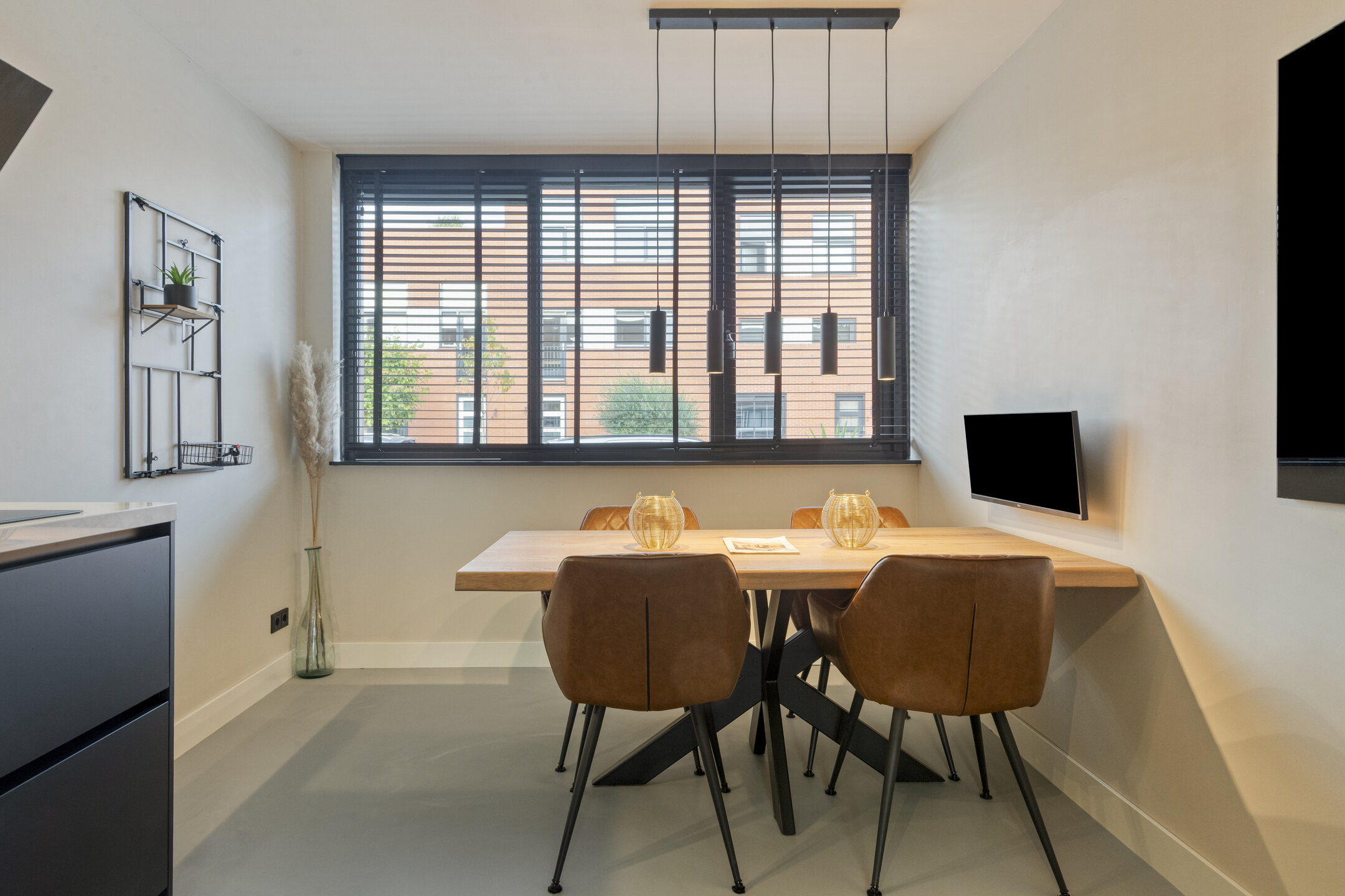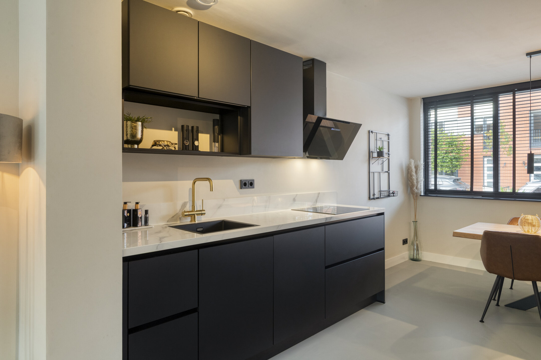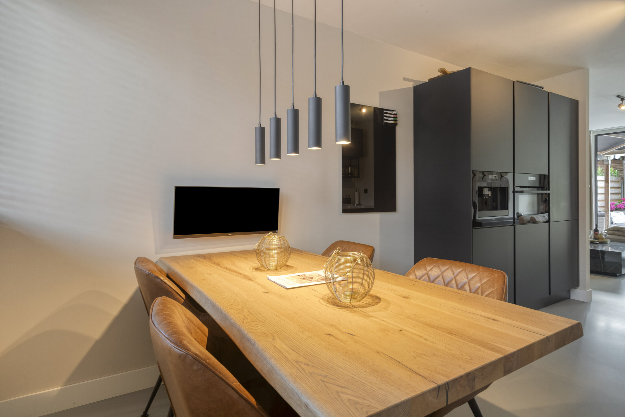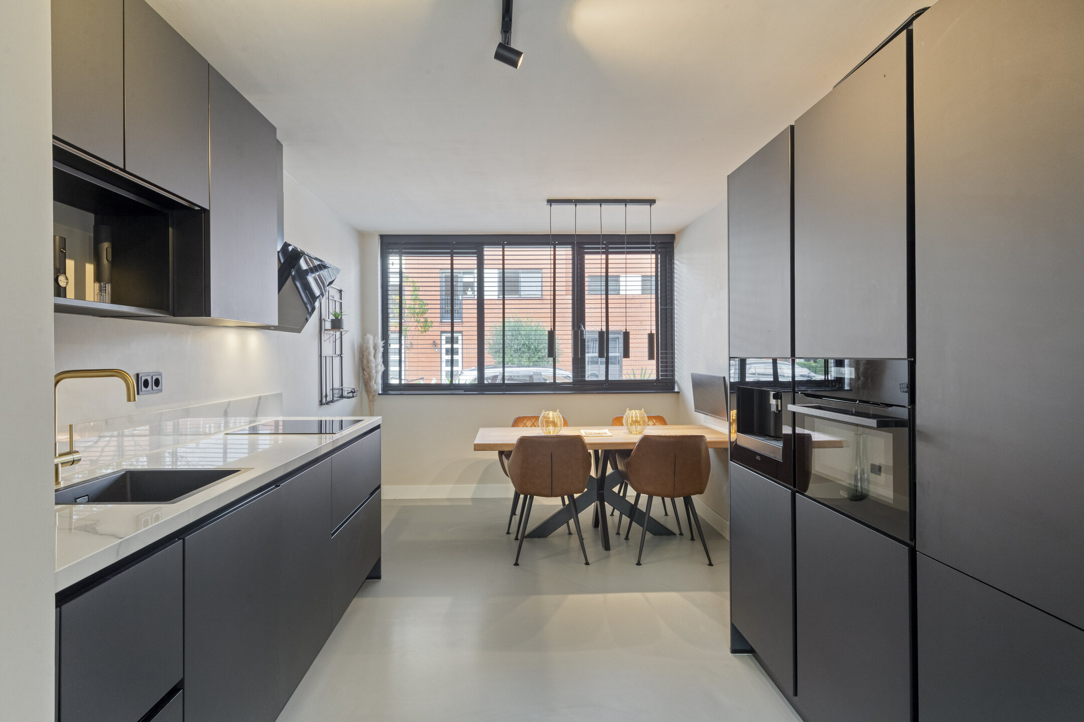 Aan de voorzijde van de woning bevindt zich de moderne keuken (2023), uitgerust met hoogwaardige inbouwapparatuur zoals een inductiekookplaat, afzuigkap, vaatwasser, combi-oven en ingebouwd koffieapparaat. De woonkamer ademt comfort, stijl en eigentijdse klasse, een heerlijke plek om thuis te komen.