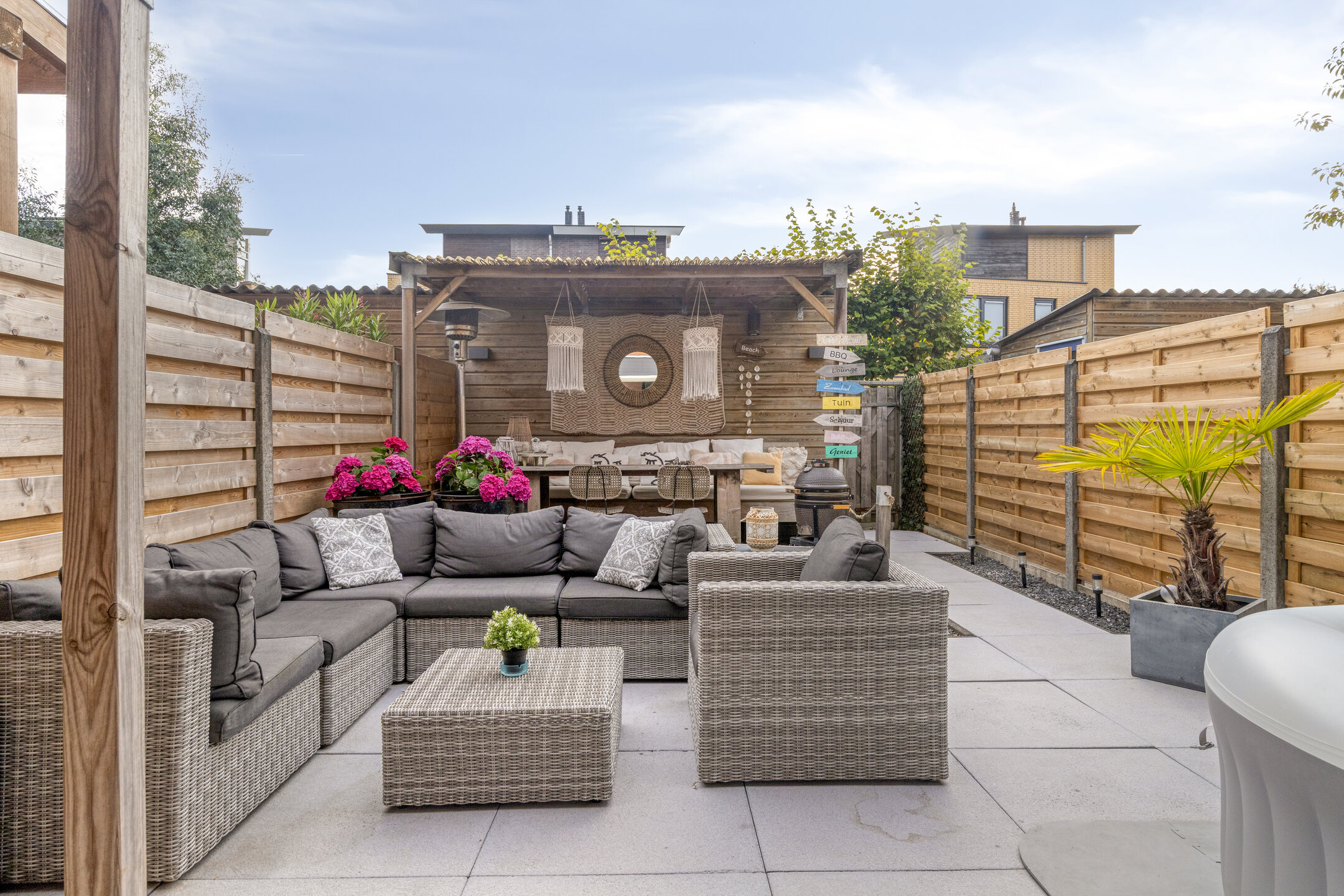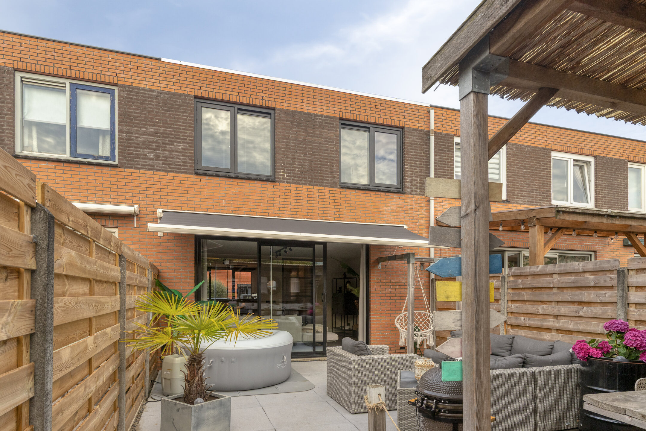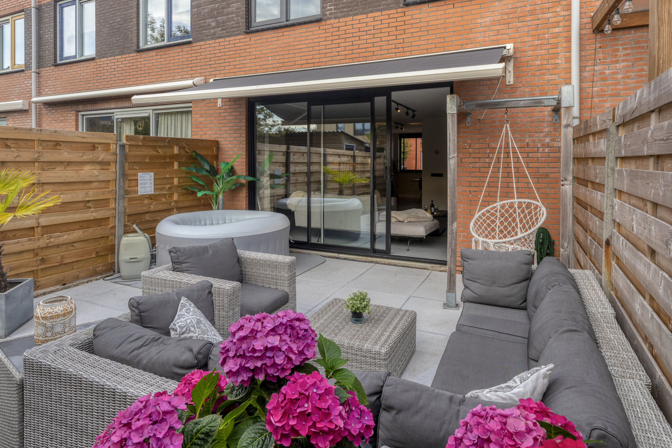 Via de aluminium schuifpui bereikt u de zonnige achtertuin, gelegen op het zuidwesten. De tuin is keurig aangelegd en voorzien van een achterom, overkapping, vernieuwde schuttingen, een in hout opgetrokken berging en een zonnescherm (2023). Hier geniet u volop van rust, privacy en zon.